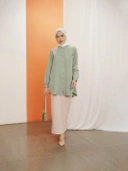 Blouse dengan design simple yang elegan dengan keunikannya sendiri. Detail kerah sanghai, bukaan kancing pada sisi depan sehingga breastfeeding friendly, dan detail aksen origami pada sisi belakang.